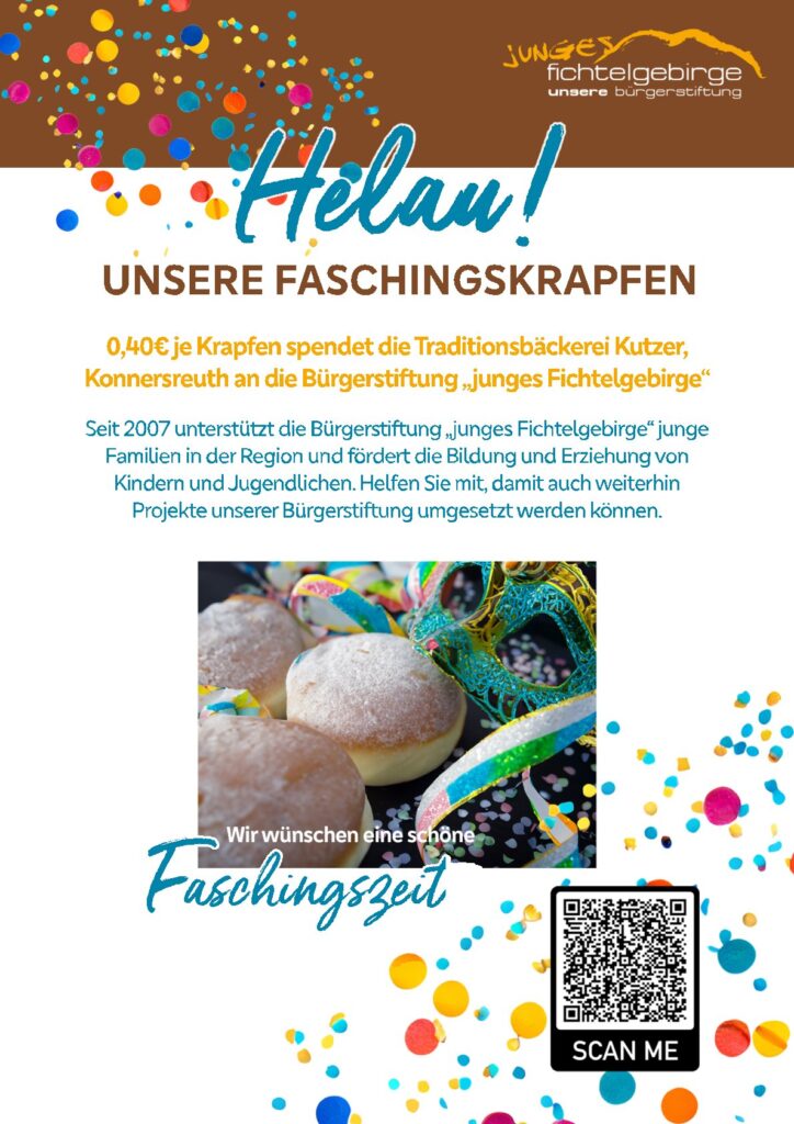 Für den Start in das Jahr 2026 hat die Bürgerstiftung in Zusammenarbeit mit der Bäckerei Kutzer aus Konnersreuth wieder das beliebte Programm für die närrische Zeit für Sie: die Faschingskrapfen-Aktion!